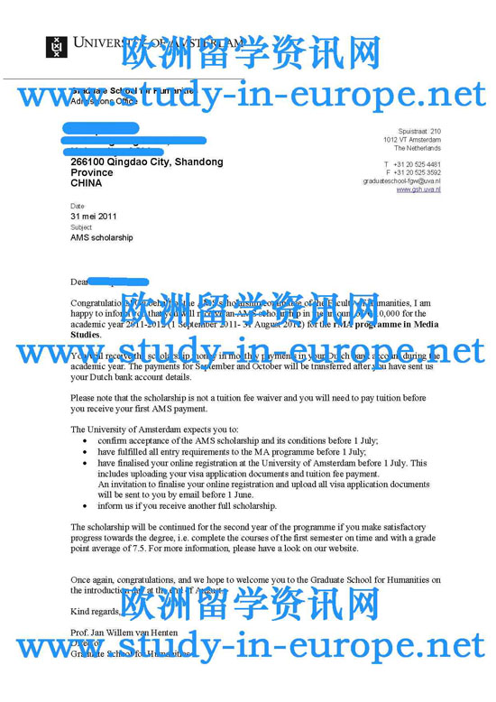 案例三 中国海洋大学新闻学专业,被阿姆斯特丹大学媒体研究专业硕士课程录取,学制2年,并获得阿姆斯特丹大学AMS奖学金10000欧元.