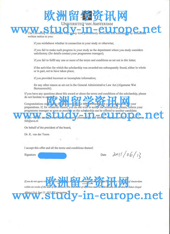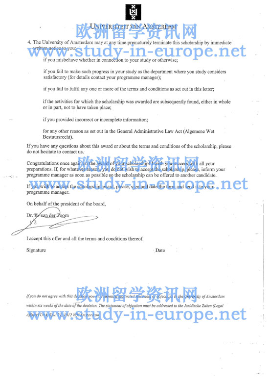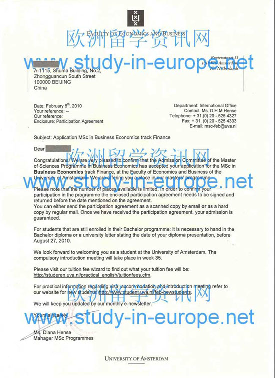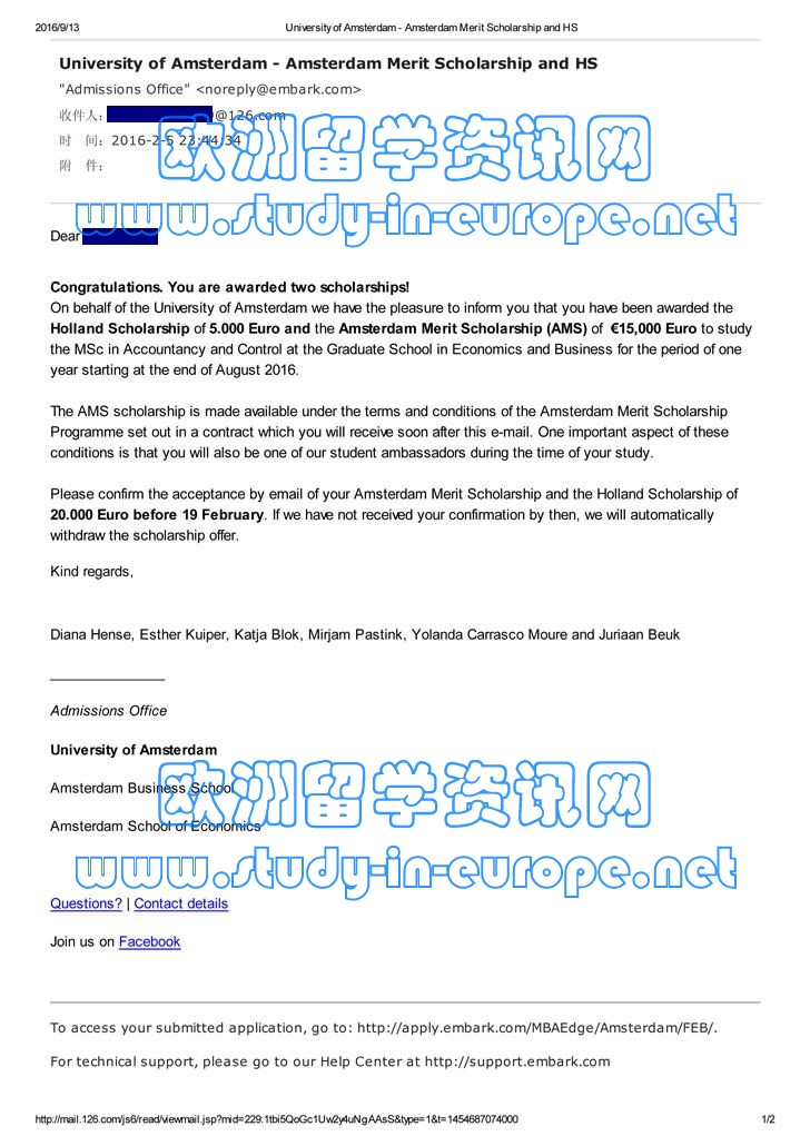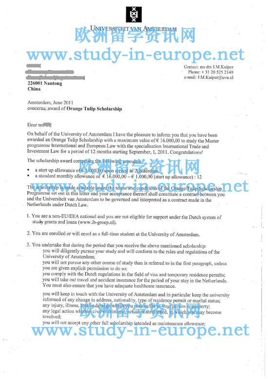 案例二 西南财经大学金融管理专业,学士学位,被阿姆斯特丹大学商业经济学专业硕士课程录取,学制1年,并获得阿姆斯特丹大学AMS奖学金12000欧元.