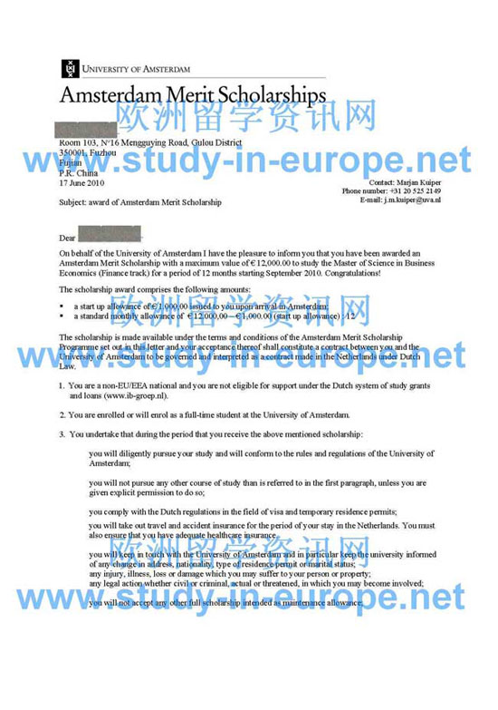 案例四 厦门大学银行学专业, 学士学位, 被阿姆斯特丹大学商业经济学专业硕士课程录取,学制1年,并获得阿姆斯特丹大学Amsterdam Merit Scholarship奖学金12000欧元.