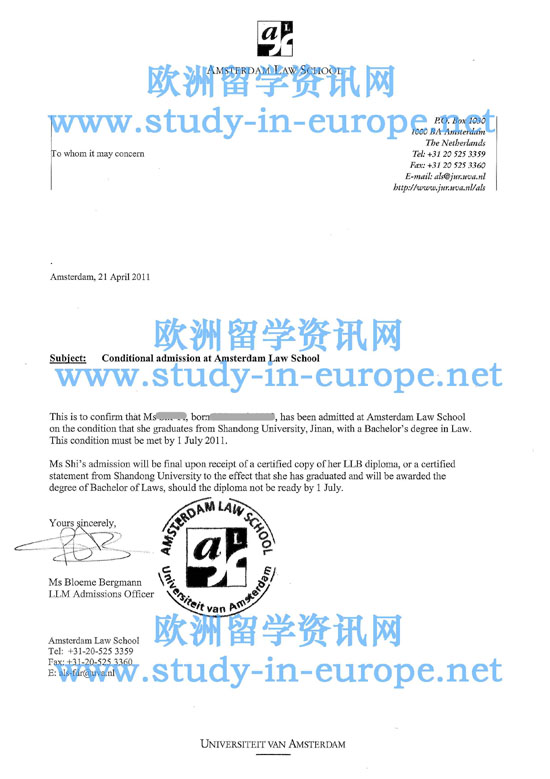 案例五 山东大学法学专业, 被阿姆斯特丹大学国际与欧洲法专业硕士课程录取,学制1年,并获得橙色郁金香奖学金16000欧元.